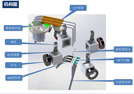 在藥粒檢測過程中,需進行藥粒上白點、藥粒圓不圓、藥粒的粘連、藥粒的色澤正確等功能,檢測完成后輸出OK、NG信號,在排廢位進行剔除動作。系統(tǒng)采用進口工業(yè)相機快速獲取產品圖像,通過圖像識別、分析和計算,輸出檢測信號。 二、【藥粒檢測系統(tǒng)結構圖】
