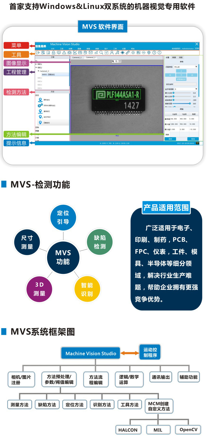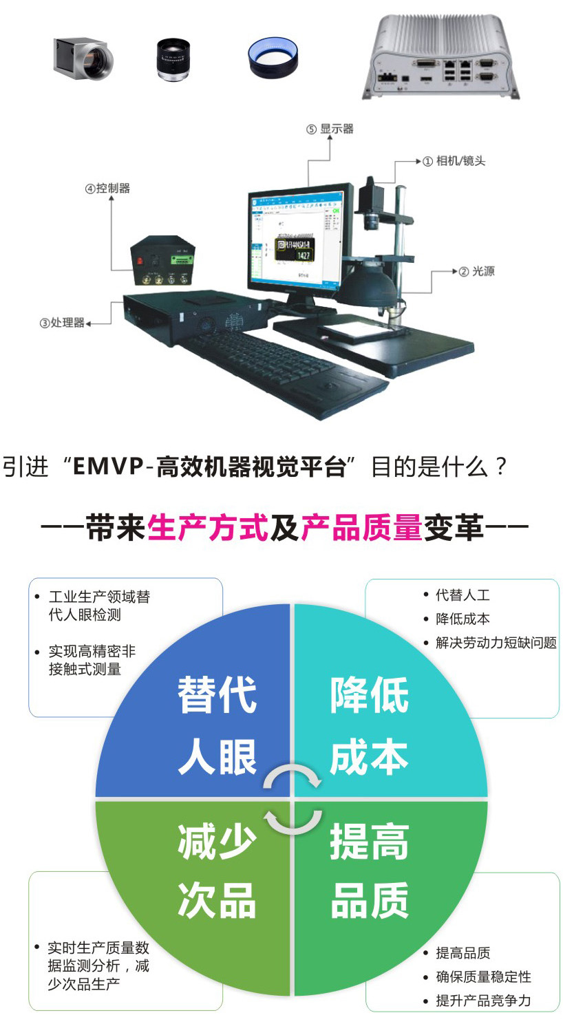 ▆ EMVP介紹 EMVP開放式機器視覺平臺是海克易邦獨立自主開發的機器視覺產品。該產品集軟件和硬件于一體,整合本公司在機器視覺行業十年技術積累,同時結合各類視覺檢測的實際需求而推出,為客戶提供最優的機器視覺解決方案。產品軟件最新推出MVS版本,操作更加簡單,設置更加靈活,同時支持高級用戶二次開發。EMVP機器視覺平臺具有集成度高、功能豐富、穩定可靠等特點,適用于缺陷檢測、尺寸測量、定位引導、字符識別、平整度檢測等機器視覺應用領域。