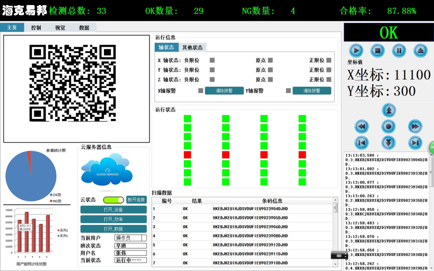 云平臺可監控記錄設備的運動參數及視覺的檢測結果,通過互聯網隨時監控生產數據及設備運行情況。