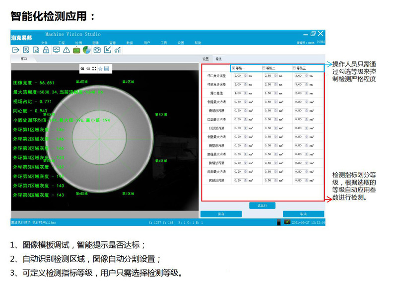 1.產(chǎn)品自動(dòng)定位:檢測(cè)時(shí)實(shí)時(shí)定位商標(biāo)特定圖案,給出當(dāng)前位置的初始位置的偏差,檢測(cè)區(qū)域位置自動(dòng)補(bǔ)償,實(shí)現(xiàn)產(chǎn)品自動(dòng)定位功能。