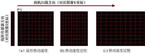 線陣相機的取像原理與面陣不同,它每次只采集一行圖像,只有在鏡頭與被拍攝物體之間存在相對運動時才能采完一幀完整的二維影像。圖2中,縱向為線陣傳感器的方向,其分辨率由線陣CCD決定;橫向表示相機的掃描方向,其分辨率由步進電機的最小步距決定。電機運動速度過大,圖像會被壓縮,如圖2(b)所示;速度太小,圖像則會被拉伸,如圖2(c)。
