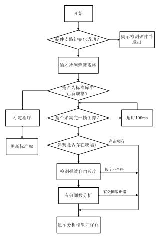 彈簧自動檢測系統的軟件部分采用NI公司的LabVIEW圖形編程語言開發。LabVIEW直觀的圖標操作、高效的多線程并行處理以及方便的模塊化特性使得程序的開發周期大大縮短,程序執行效率高且擴展能力強,便于隨時查錯和修改。彈簧檢測部分的流程如圖4所示,程序主要由幾個功能模塊組成:彈簧標準庫更新、圖像采集、圖像處理以及數據分析處理模塊。