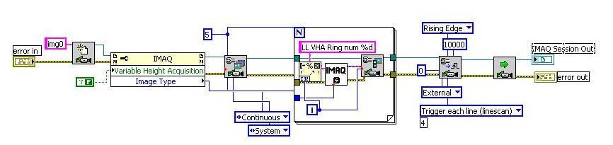 對于線陣圖像的外部觸發取像,IMAQ提供了兩種基本觸發模式:可變高度采集(Variable Height Acquisition)和線觸發采集(Trigger Each Line)。本文采用兩種采集方式相結合的方法。因為待測彈簧外徑大小可變,VHA采集模式可以適應變高度的圖像采集,Trigger Each Line模式則保證了相機的線掃率與馬達速度同步。