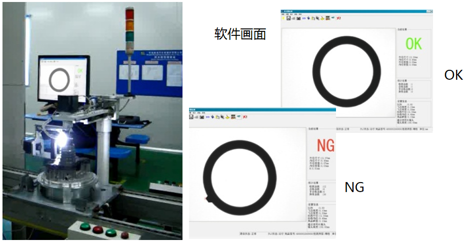“密封圈缺陷視覺檢測系統”針對密封圈質量(邊緣缺口毛刺、內外徑尺寸)進行檢測。相機快速采集生產線上密封圈圖像,將圖像數據傳送到圖像處理系統,圖像處理系統對每幅圖像進行預處理、尺寸測量等運算,通過與標準模板圖像及設定參數進行比較,來判斷產品是否合格,輸出廢品報警信息及剔廢控制信號,由機械系統剔除廢品,從而保證密封圈質量。本系統主要應用于各類規格密封圈生產過程中的缺陷檢測,并可延伸至相關產品或行業的應用中。